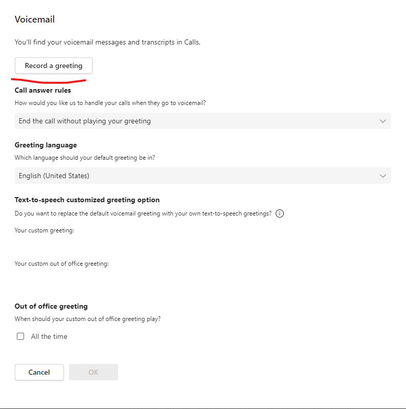 - If you press record a greeting, your Teams extension will ring and you will be able to record a greeting.
